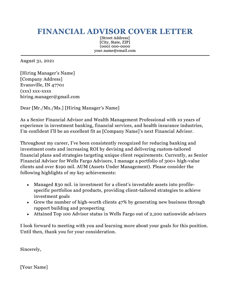 As a Senior Financial Advisor and Wealth Management Professional with 10 years of experience in investment banking, financial services, and health insurance industries, I’m confident I’ll be an excellent fit as [Company Name]’s next Financial Advisor.