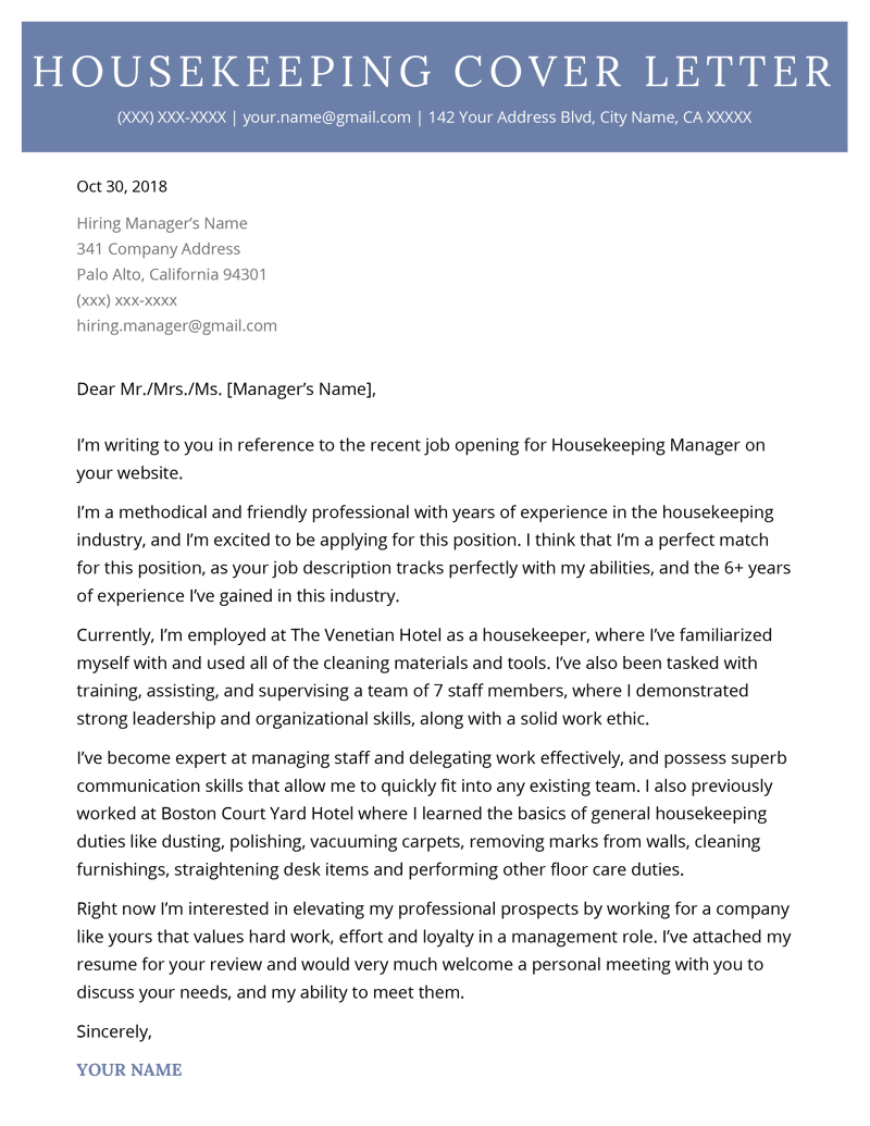 But because housekeeping work doesn’t usually require a specific educational background, standing out from other applicants depends on having a convincing cover letter.