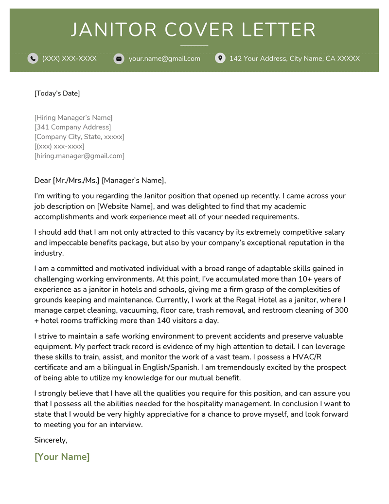 Download and customize our janitor cover letter example to reflect your own experiences, and land more interviews. A clean and pristine cover letter will increase your chances of landing employment.