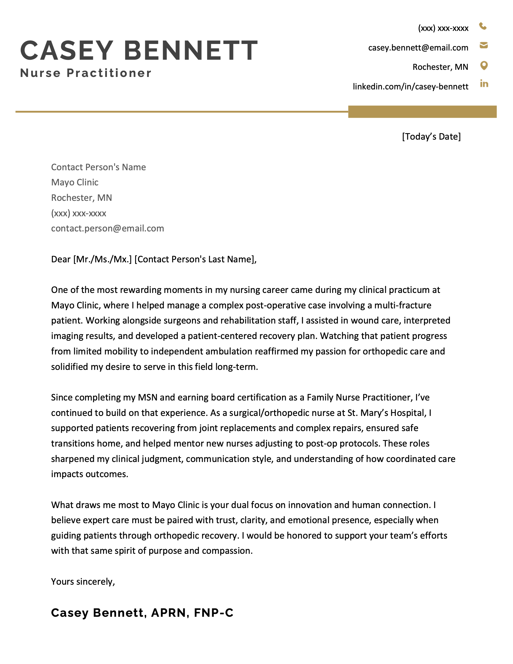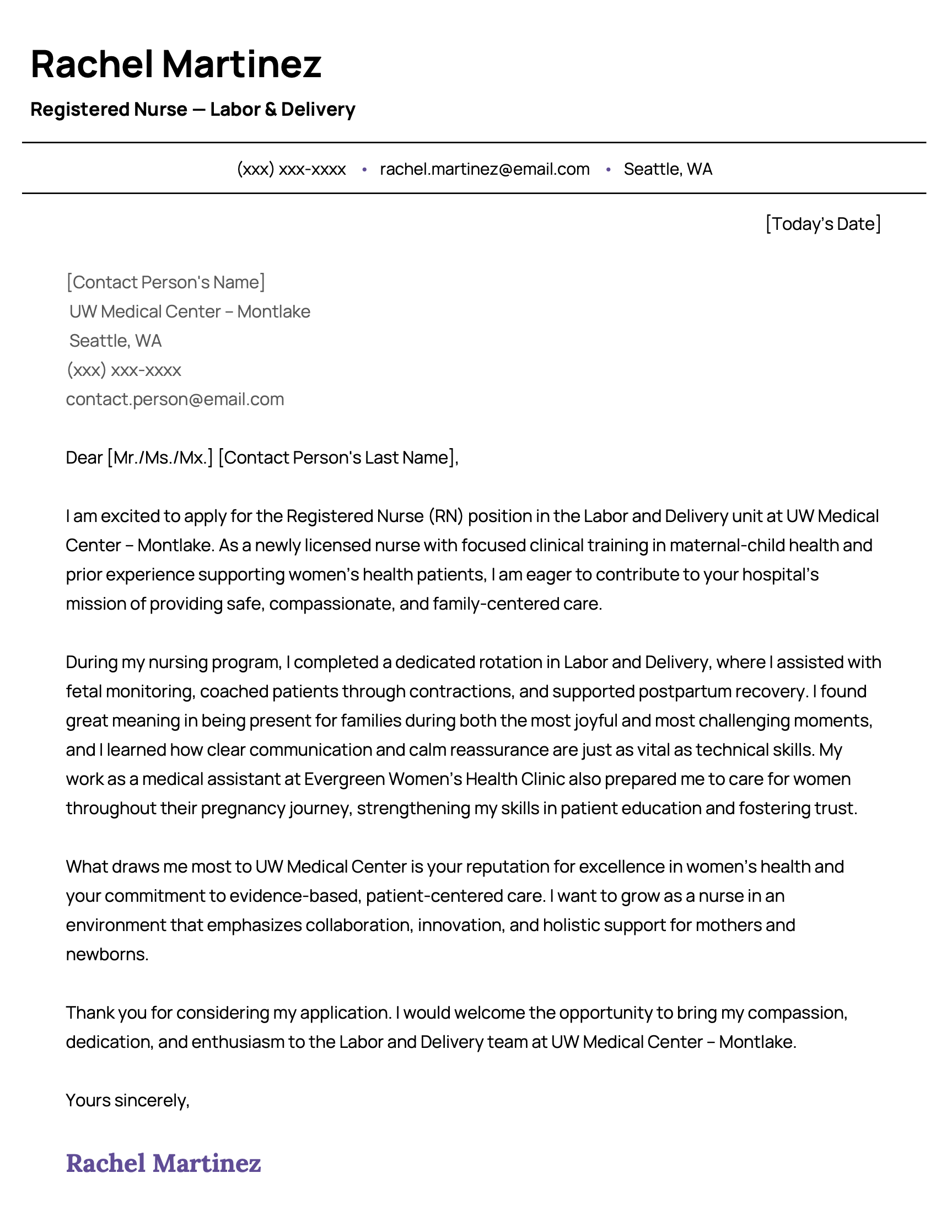 - Motivation statement: Explain why you’re interested in this specific healthcare organization or unit. This might include alignment with the hospital’s mission, patient population, care philosophy, or opportunities for professional growth.
