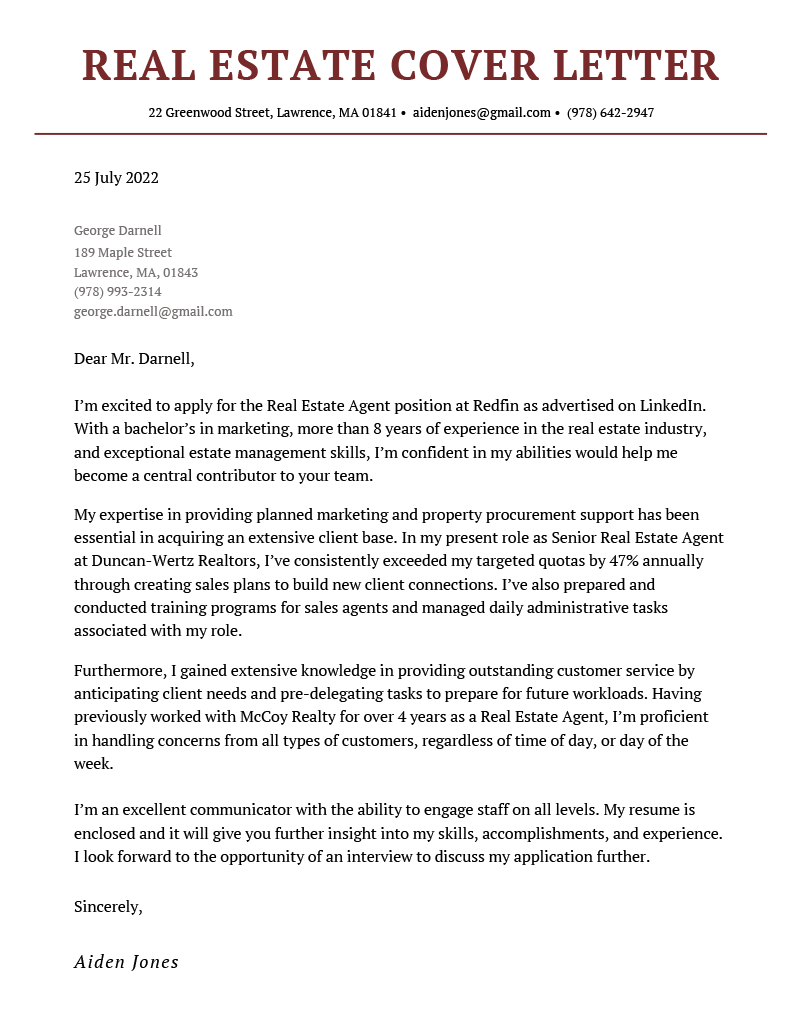 Here’s an example of a well-written cover letter introduction for a real estate agent: