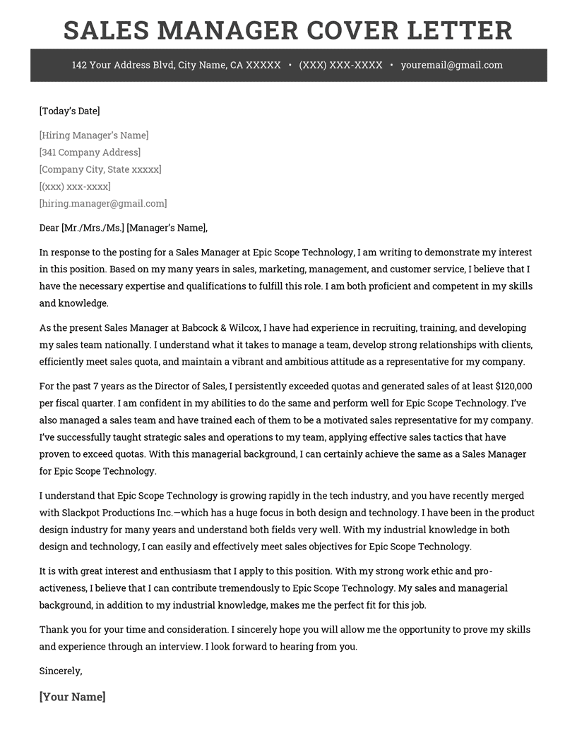 Sell hiring managers on your expert-level management abilities with our sales manager cover letter sample. Or, save time by using our cover letter builder.