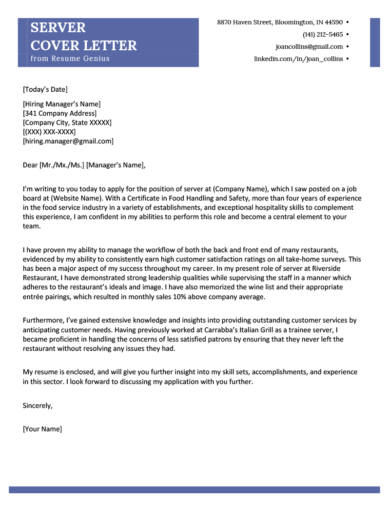 Pair your server resume with a well-written cover letter to prove you’re the right person for the job.
