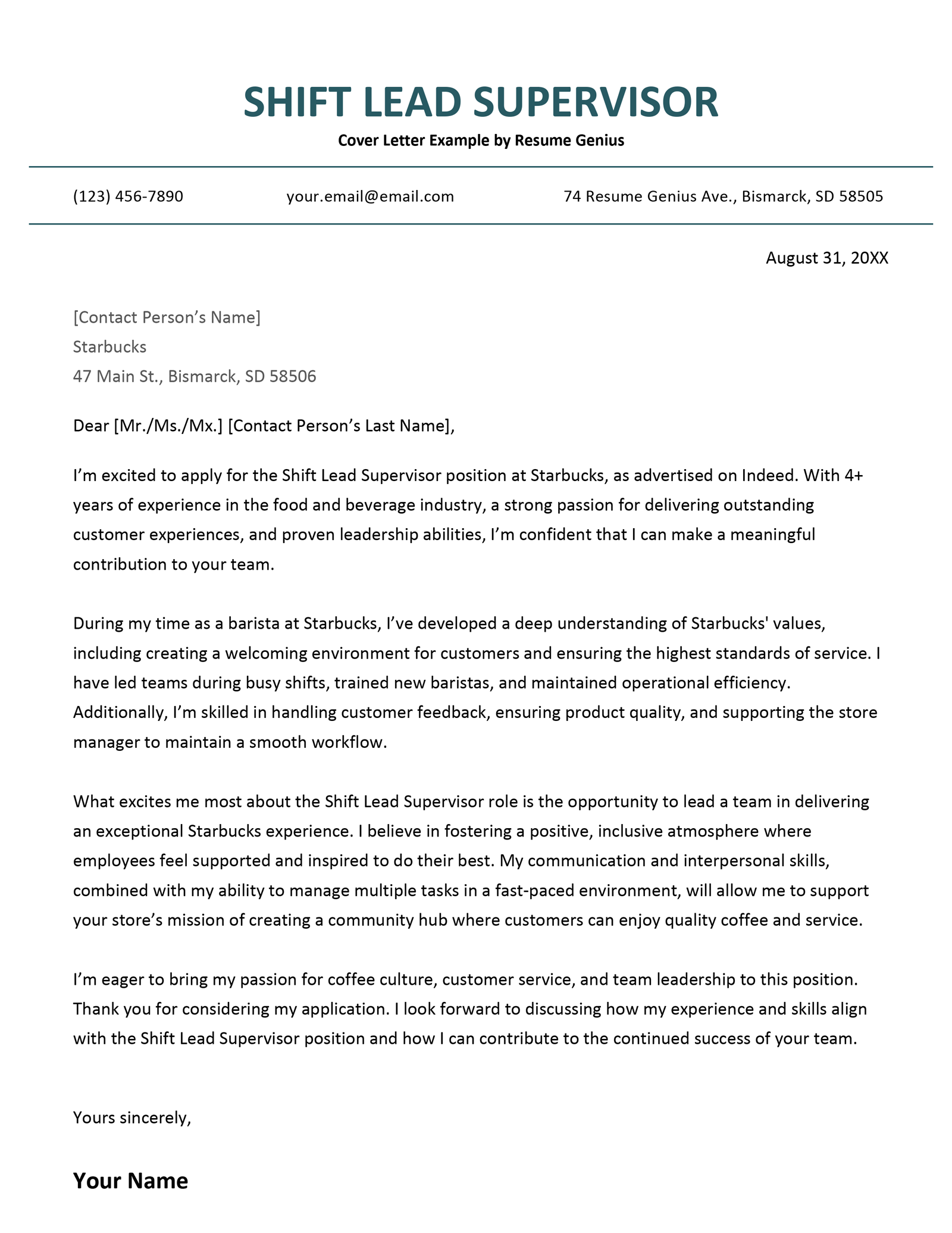 Beyond food service, this shift supervisor cover letter is designed for any industry that requires floor management and leadership:
