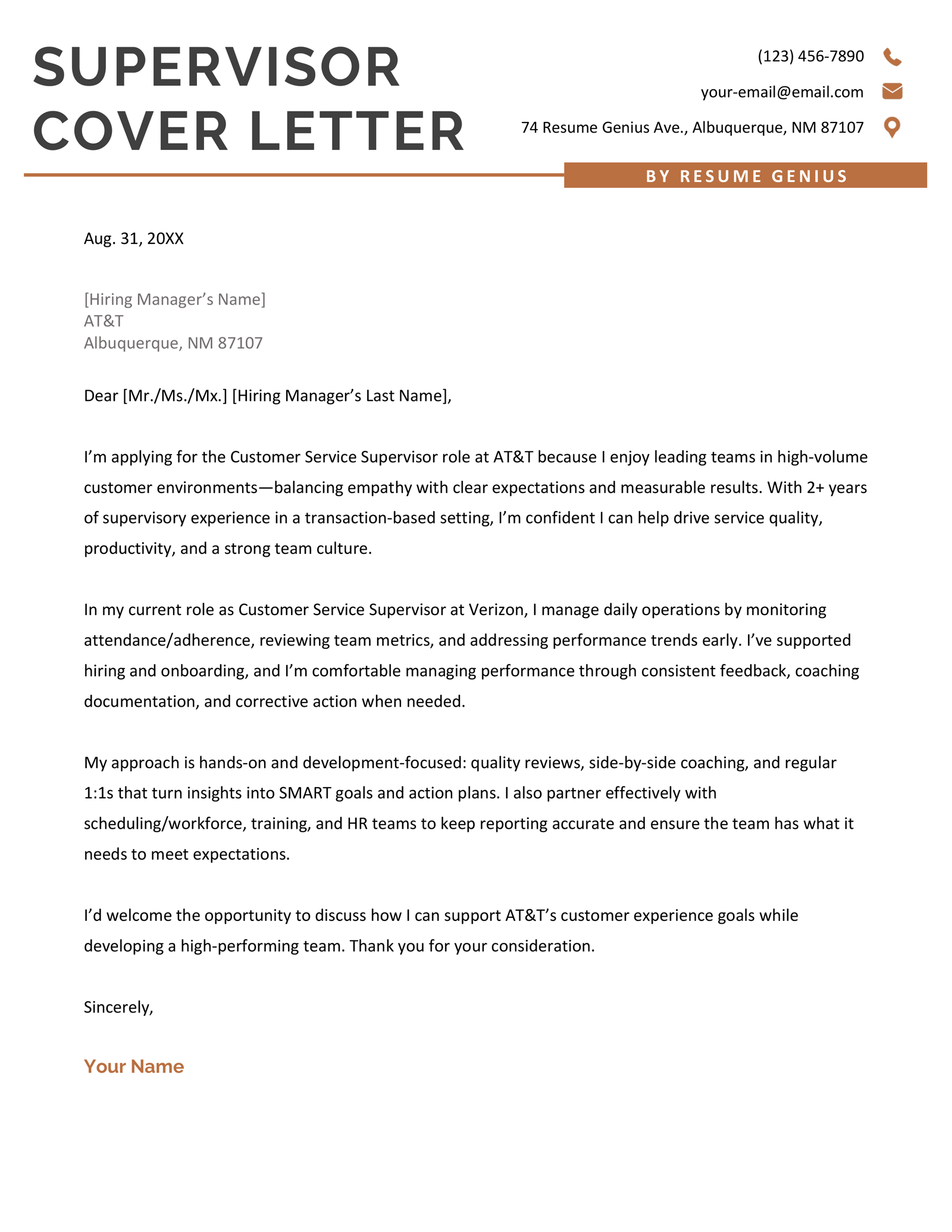This template follows the cover letter structure and format expected by employers seeking supervisors in all industries. Tailor it to the job posting and add in your own details to create a persuasive cover letter:
