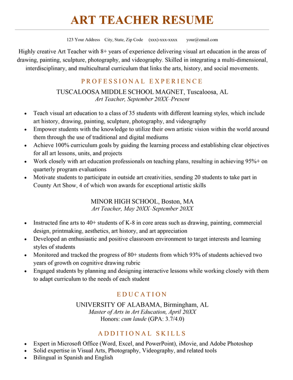 - Open with a strong resume summary to sum up your art teacher qualifications and focus on how your skills and experience can directly benefit the school or institution.