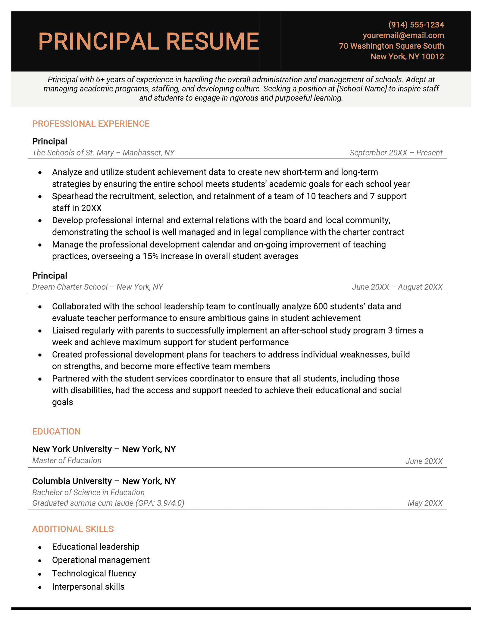 Principal with 6+ years of experience in handling the overall administration and management of schools. Adept at managing academic programs, staffing, and developing culture. Seeking a position at [School Name] to inspire staff and students to engage in rigorous and purposeful learning.