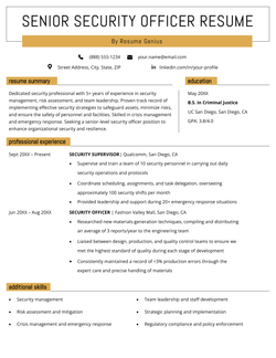 Your resume summary appears at the top of your resume, under your name and basic info. Show employers your relevant security officer experience, key responsibilities and achievements, as well as any related skills and certifications.