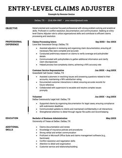 That’s why employers seek highly analytical claims adjusters they can count on to make fair decisions. Also, claims adjusting is a people-facing role with a lot of time spent out in the field. Therefore, your claims adjuster resume needs to show your ability to communicate effectively, handle grievances, and settle disputes.